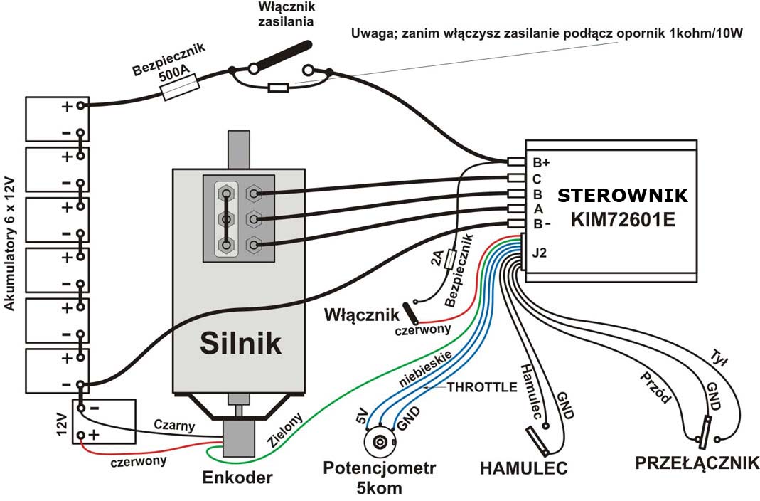 Elektroniczny sterownik silników indukcyjnych, służy do płynnej regulacji obrotów silnika. Za pomocą tego urządzenia można płynnie regulować prędkość jazdy skutera, motocykla, gokarta, łodzi, samochodu lub innego pojazdu. Uruchomienie sterownika: 1. W celu dobrego odprowadzenia ciepła z obudowy sterownika urządzenie należy przymocować do metalowej ramy pojazdu lub do radiatora z wentylatorem. 2. Do zacisków A, B i C podłączyć silnik indukcyjny. 3. Połączenia należy wykonać kablem o przekroju co najmniej 50mm2. 4. Do zacisku B- podłączyć minus zasilania. 5. Do zacisku B+ podłączyć plus zasilania. 6. Do gniazda J2 włożyć wtyczkę kabla z potencjometrem. 7. Do przewodu czerwonego i do zacisku B+ podłączyć włącznik i szeregowo z nim bezpiecznik 2A, wszystkie połączenia należy wykonać zgodnie z rysunkiem w instrukcji 8. Za pomocą włącznika można włączać i wyłączać silnik w każdym momencie jego pracy. 9. Aby z powrotem włączyć silnik, należy potencjometrem zjechać do zera. 10.Do zasilania powinien też być podłączony bezpiecznik 500A. 11. Po dłuższej ciągłej pracy należy sprawdzić jak mocno się grzeje obudowa sterownika i zaciski A, B, C. 12. Jeżeli zaciski przewodów lub obudowa jest tak gorąca że nie można jej utrzymać w ręce, to można ją chłodzić wentylatorem. |