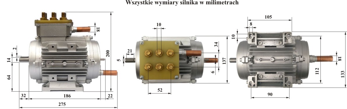 | Silnik najbardziej polecany: do napędu skutera, motocykla, gokarta, quada, trójkołowca, buggy, lekkich pojazdów oraz pontonu, łódki, motorówki, katamarana i innych lekkich jednostek pływających. Do pompy, podnośnika, wyciągarki i urządzeń, które wymagają łagodny start. Moc silnika zależy od napięcia z jakiego jest zasilany. Gdy silnik jest zasilany z napięcia 24V to osiąga moc tylko 3kW a gdy jest zasilany z napięcia 200V to osiąga moc aż 24kW. Gdy silnik jest bardzo dobrze chłodzony olejem, to może ciągle, pobierać prąd 230A, a przy zasilaniu 200V osiąga moc 16kW, oraz może przez 20 sekund pobierać prąd 350A, osiąga wtedy moc 24kW. Jeżeli pełna moc silnika będzie wykorzystywana rzadziej i krótko to do silnika wystarczy wlać tylko około 0,5 litra oleju Reniso Km32, który jest stosowany w chłodnictwie. Gdy pełna moc silnika będzie wykorzystywana często i długo to do silnika należy podłączyć chłodnicę lub nagrzewnicę samochodową, zbiorniczek wyrównawczy i pompkę oleju. Do układu chłodzenia należy nalać tyle oleju aby on zaczął równomiernie krążyć. Temperatura silnika nie powinna przekraczać 90°C. Obroty silnika zależą też od napięcia z jakiego jest zasilany, im wyższe napięcie tym większe osiąga obroty. Gdy silnik jest zasilany napięciem 200V, to przy maksymalnej mocy osiąga około 8200 obrotów na minutę. UWAGA ! Przewody łączące sterownik z silnikiem powinny być jak najkrótsze. Śruby mocujące przewody elektryczne należy osłonić izolacyjną pokrywą. |