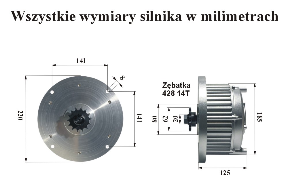 | Silnik najbardziej polecany: do napędu skutera, motocykla, gokarta, quada, trójkołowca, buggy, lekkich pojazdów, pontonu, łódki, motorówki i innych lekkich jednostek pływających. Do pompy, podnośnika, wyciągarki i urządzeń które wymagają łagodny start. Moc silnika zależy od chłodzenia, im silnik jest lepiej chłodzony tym dłużej pracuje z maksymalną mocą. Aby zwiększyć chłodzenie, po bokach silnika można zamontować dwa mocne wentylatory. Gdy silnik jest bardzo dobrze chłodzony, to może bez przerwy pobierać prąd 200A, osiągając moc 22kW, oraz może przez 20 sekund pobierać prąd 400A, wtedy osiąga moc 45kW. Przewody zasilające silnik są grube, mają 16mm2 Temperatura silnika nie może przekraczać 90°C. Obroty silnika zależą od napięcia, im wyższe napięcie na silnik, tym większe osiąga obroty. Gdy silnik jest zasilany napięciem 120V, to przy maksymalnej mocy osiąga około 6800 obrotów na minutę. UWAGA! Przewody łączące sterownik z silnikiem powinny być jak najkrótsze. Powinny być łączone najlepiej za pomocą lutowania, na złącze lutowane powinna być nałożona koszulka termokurczliwa. |