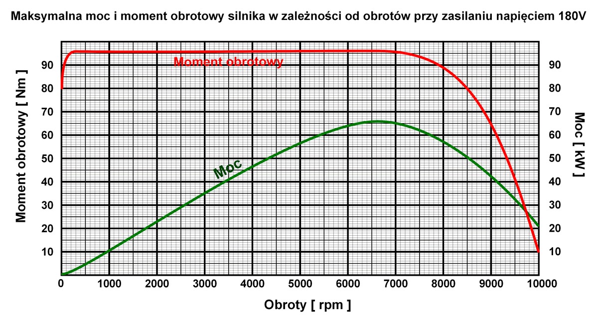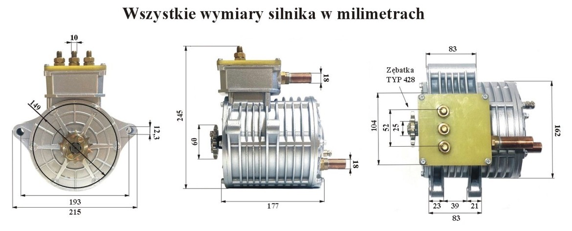 | Silnik najbardziej polecany: do napędu skutera, motocykla, gokarta, quada, trójkołowca, buggy. Moc silnika zależy od napięcia z jakiego jest zasilany. Gdy silnik jest zasilany z napięcia 24V to osiąga moc tylko 9kW a gdy jest zasilany z napięcia 180V to osiąga moc aż 66kW. Gdy silnik jest bardzo dobrze chłodzony olejem, to może ciągle, pobierać prąd 460A, a przy zasilaniu 180V osiąga moc 44kW, oraz może przez 20 sekund pobierać prąd 700A, osiąga wtedy moc 66kW. Jeżeli pełna moc silnika będzie wykorzystywana rzadziej i krótko to do silnika wystarczy wlać tylko około 1,2 litra oleju Reniso Km32, który jest stosowany w chłodnictwie. Gdy pełna moc silnika będzie wykorzystywana często i długo to do silnika należy podłączyć chłodnicę lub nagrzewnicę samochodową, zbiorniczek wyrównawczy i pompkę oleju. Do układu chłodzenia należy nalać tyle oleju aby on zaczął równomiernie krążyć. Temperatura silnika nie powinna przekraczać 90°C. Obroty silnika zależą też od napięcia z jakiego jest zasilany, im wyższe napięcie tym większe osiąga obroty. Gdy silnik jest zasilany napięciem 180V, to przy maksymalnej mocy osiąga około 6600 obrotów na minutę. UWAGA ! Przewody łączące sterownik z silnikiem powinny być jak najkrótsze. Śruby mocujące przewody elektryczne należy osłonić izolacyjną pokrywą. |