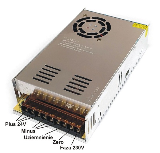 | Jest to zasilacz do urządzeń na napięcie 24V i maksymalnym poborze prądu 16A. Wentylator umożliwia prawidłową pracę zasilacza nawet w temperaturze 35stC.